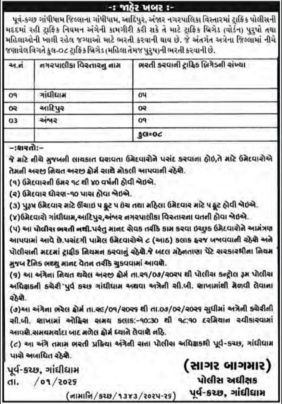 ट्रैफिक ब्रिगेड रिक्रूटमेंट 2026 का नोटिफिकेशन ऑफिशियली जारी कर दिया गया है। इसमें पुरुषों और महिलाओं दोनों के लिए ट्रैफिक ब्रिगेड (वार्डन) पोस्ट पर भर्ती की जाएगी। यह भर्ती ड्राइव ईस्ट कच्छ (गांधीधाम डिस्ट्रिक्ट) के गांधीधाम, आदिपुर और अंजार म्युनिसिपैलिटी में ट्रैफिक पुलिस की मदद के लिए चलाई जा रही है।